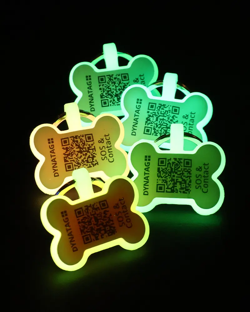 SOS-dierenpenning in fluorescerend lichtgroen en modern botvormig design: maximale zichtbaarheid overdag en 's nachts