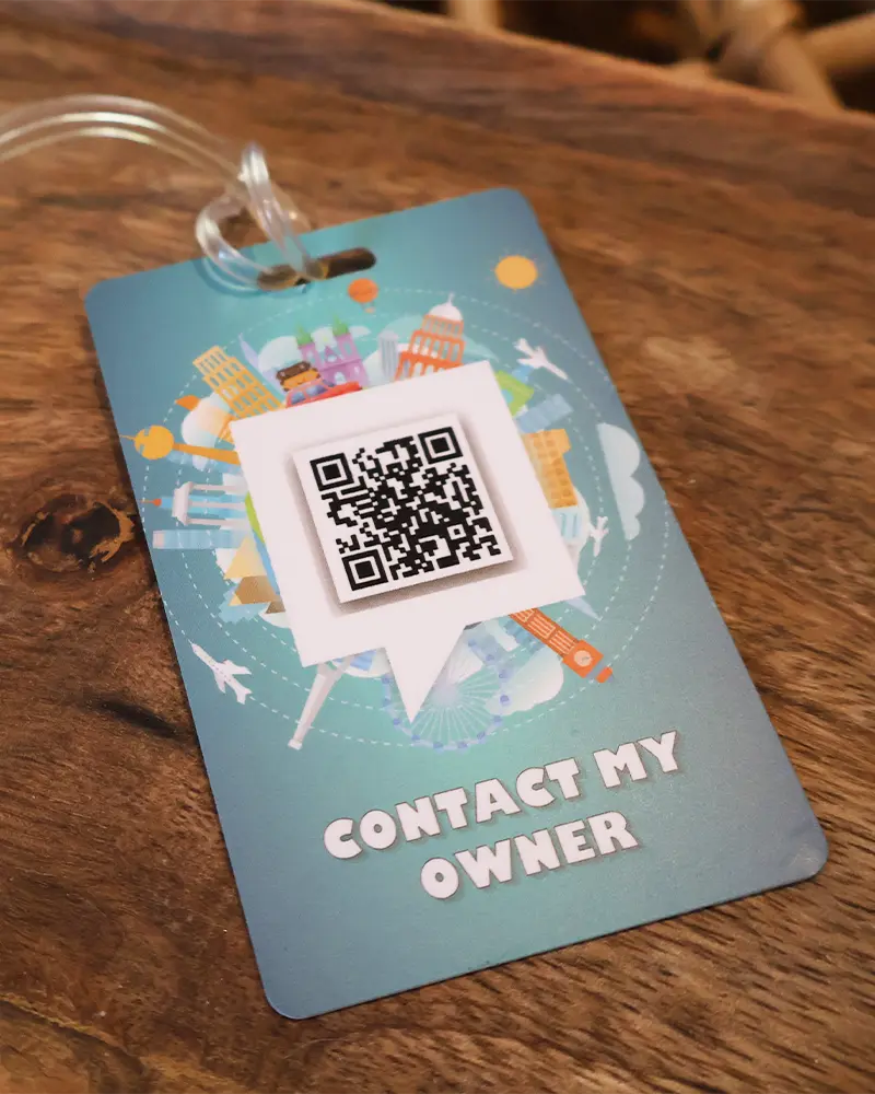 Stijlvol en kleurrijk digitaal bagagelabel met QR-code – zodat jouw bagage altijd de weg terug naar jou vindt.