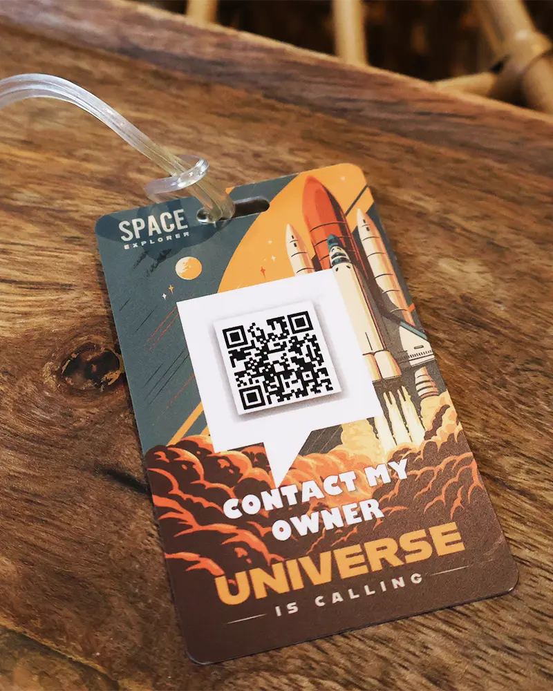 Stijlvol en kleurrijk digitaal bagagelabel met QR-code – zodat jouw bagage altijd de weg terug naar jou vindt.